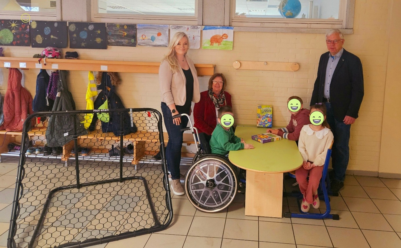 Die Grundschule Neubörger konnte sich über eine Spende in Höhe von 1.000,- freuen. Die Schulleiterin Frau Esther Jansen bedankte sich bei Herrn Hansen und Frau Brauer von der Schomaker Dörpen Stiftung. Die Spende ermöglichte die Anschaffung eines individuellen Tisches für ein Rollstuhlkind und eines Rebounders für ihn und die Schulgemeinschaft. Die Stiftung erhielt viel Applaus von den Kindern und Kollegen.